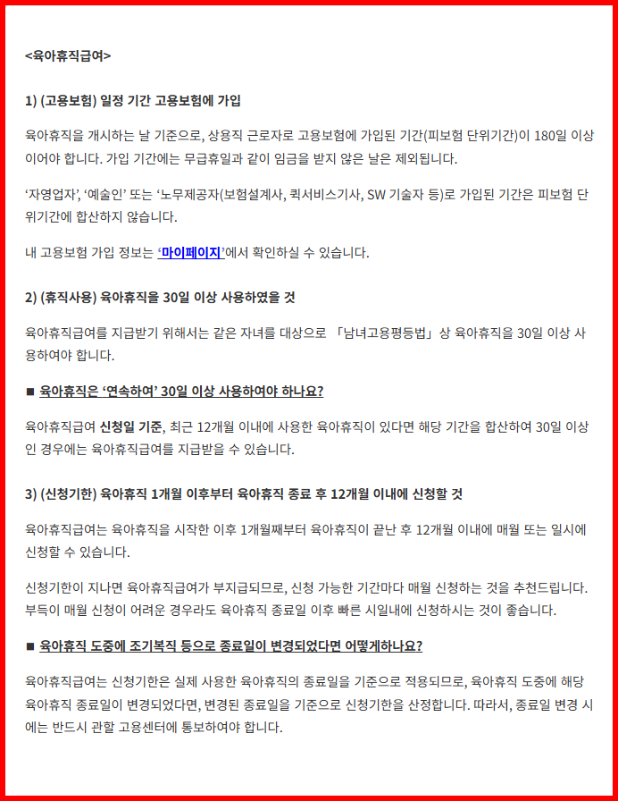육아휴직급여를 받기 위해서는 아래 조건을 모두 충족해야 합니다.